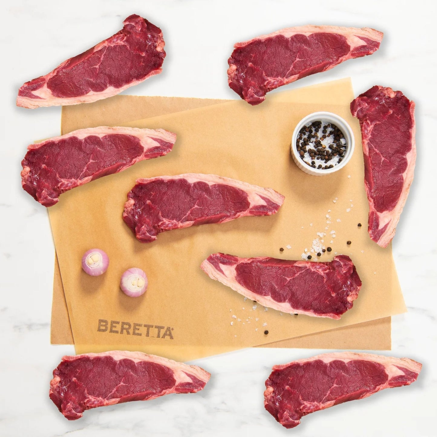 Our Striploin Steaks are a must have! This cut comes from the short loin, near the tenderloin, which means it is very well-marbled. Striploin is often compared to Tenderloin, as it rivals and resembles its tenderness. However, Striploin has more marbling and arguably more flavor, and is considered by many steak enthusiasts as the best steak!
